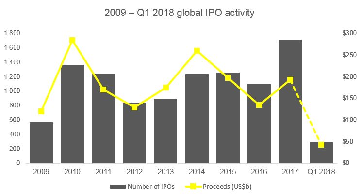 Globalt visar noteringstrenden ett starkt resultat under de första tre månaderna 2018 trots geopolitisk osäkerhet och volatilitet på marknaden. Den globala IPO-marknaden ökade 42,8 miljarder USD under första kvartalet 2018, vilket är en ökning med 28 procent jämfört med samma period förra året. Antalet IPOs under årets första kvartal var 287 vilket är 27 procent lägre än första kvartalet 2017, men förra årets första kvartal hade också högst antalet noteringar för första kvartalet sedan 2007. Asien-Stillahavsområdet visar en fortsatt hög IPO-aktivitet och har flest antal noteringar under första kvartalet.