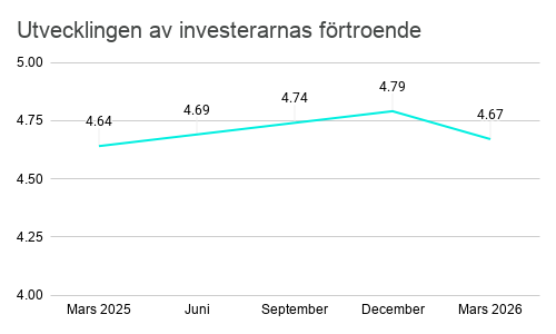 Indexet som mäter investerarnas självförtroende sjönk från nivån 4,79 i december 2025 till 4,67 i mars 2026. Indexet utgår från frågan: “Hur säker känner du dig just nu över din förmåga att välja nya investeringar? (Svara på en skala från 1 till 7, där 1 = Inte alls säker och 7 = Mycket säker)”. Trots den nedåtgående trenden är nivån fortfarande högre än ett år tidigare.