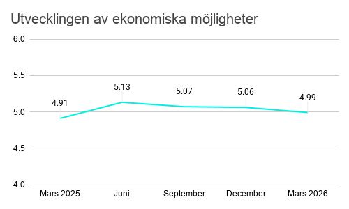 Även investerarnas bedömningar av de egna ekonomiska möjligheterna försämrades något. När investerarna tillfrågades om sina möjligheter att spara eller investera under de följande tre månaderna (på skalan 1–7), sjönk indexet från 5,06 i december till 4,99 i mars. Nivån är ändå fortfarande högre än ett år tidigare.