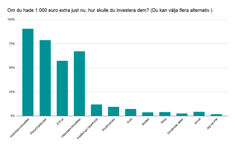 När investerarna tillfrågades om var de skulle investera 1 000 euro just nu, framhävdes både fonder och aktier i svaren.