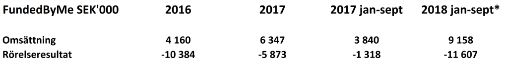 Figur 2. FundedByMes omsättning och rörelseresultat i SEK’000. * Inkluderar Laika Consulting AB siffror från 2 augusti till september 2018.
